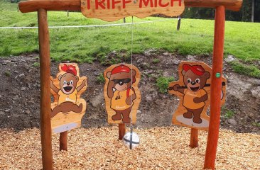 Weiter geht es zu den Stationen des Bärtls Familienwanderweges. Wir wandern entlang dichter Wälder, über saftige Wiesen. Bei den verschiedenen Stationen kann sich Isabel austoben. Die Stationen eignen sich zum Balancieren, Klettern und Schaukeln. Doch das war noch nicht alles. Beim Weitwurf, auf der Stehwippe oder am Klettergarten hat die Kleine besonders viel Spaß.