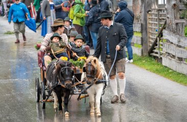 Pünktlich um 13.00 Uhr eröffnet der „Almi“ – schön mit Blumen geschmückt – den Almabtrieb. Gleich danach folgt die Filzmooser Schnalzergruppe hoch zu Ross und „peitscht“ das Fest ein. Gottfried Schörghofer, der seit vielen Jahren den Almabtrieb moderiert, führt auch heute durchs Programm. So ziehen die wunderschön geschmückten Kühe vom Krahlehenhof durch den Ort, gefolgt von den ebenfalls herrlich aufgekranzten Pinzgauer Kühen vom Bögrainhof, denen auch eine Ziege folgt. Danach sehen wir ein Haflingergespann vom Hammerhof sowie die Mutterkuhherde vom Pichlmayrgut. Das Norikergespann von Thomas Rettenwender und die Kuhherde vom Mooslehenhof sind nicht geschmückt. Beide Bauern hatten im heurigen Almsommer ein Unglück zu beklagen und deshalb tragen ihre Tiere keinen Schmuck. Der Sputnik vom Buschberg und jener vom Schlossbichl sind ebenfalls mit von der Partie, gleich wie der Traktor vom Häuslerbauer und der Steyr Traktor mit Baujahr 1954 vom Oberhofgut. Das Mini-Pony-Gespann vom Krahlehenhof begeistert die Zuschauer ebenso wie das Friesengespann vom Hallmooshof, das die Erntekrone mittransportiert. Ergänzt wird der Zug der Almtiere von den Norikerpferden vom Kirchgasshof sowie vom Wallehenhof und dem Noriker-Tragpferd vom Schoberhof. Den Abschluss bilden die Bergschafe vom Oberhof.