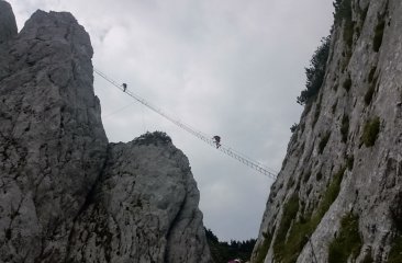 Das Highlight, aber nichts für schwache Nerven, dieser Kletterroute ist wohl die rund 40-Meter lange „Himmerlsleiter“, auf der ich mit weichen Knien mühsam und verkrampft eine tiefe Schlucht überquere. Am Gipfel des Donnerkogels angekommen belohnt der atemberaubende Ausblick auf die umliegenden Gipfel des Dachsteinmassivs sowie den tiefblauen Gosausee. Gesamt kommt man auf ein ansprechendes - und gewaltig ausgesetztes - Klettersteigabenteuer mit fantastischem Dachsteinblick.