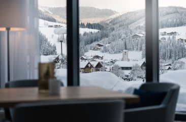 Wir nehmen Platz und sind sofort von dem herrlichen Blick auf das Bergdorf Filzmoos begeistert.