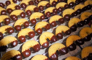 Butter, Staubzucker, Salz, Vanillezucker und Zitronenschale schaumig rühren. Ei und Eigelb zugeben. Mehl mit Nüssen vermischen und einrühren. Die Masse mit einem Spritzsack in Form von kleinen Bögen auf ein befettetes Blech geben und bei 180°C ca. 25 Minuten backen. Die Bögen vorsichtig vom Blech nehmen und auskühlen lassen. Danach je zwei Bögen mit Marmelade zusammensetzen und trocknen lassen. Nun die beiden Enden in erwärmte Schokolade tunken und Kekse auf einem Rost, unter dem man das Zeitungspapier legt, erneut trocknen lassen