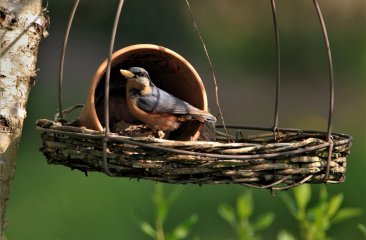 Die Grundmasse besteht aus Kokosöl, geschroteten Nüssen, Sonnenblumenkernen, Senfsamen, Hanfsamen oder gemischtem Vogelfutter. Als ersten Schritt wird das Kokosfett langsam und vorsichtig in einem Topf geschmolzen. Nun gibt man Nüsse, Kerne und Samen hinzu und vermischt alle Zutaten gut. Diese Futtermasse kann in alten Tassen, kleinen Tontöpfen, Muffin- oder Kuchenförmchen gegossen werden. Am besten man steckt gleich im Anschluss einen Zweig hinein, damit die Vöglein einen besseren Halt bei der Landung finden. Alte Tontöpfe oder Tassen mit Henkel eignen sich natürlich wunderbar, da diese ganz einfach aufzuhängen sind. Die Vögel landen aber ebenso gerne bei selbstgemachtem Vogelfutter, welches ganz einfach am Boden oder am Fensterbankerl platziert wird.