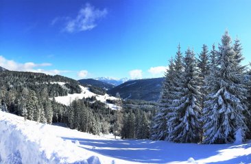 Nach ungefähr der Hälfte des Weges eröffnet sich mir eine traumhafte Aussicht auf die tiefverschneite Winterlandschaft. Der Weg führt ein Stück über die Piste und nach einer weiteren guten halben Stunde habe ich mein Ziel erreicht – die Schwaigalm.