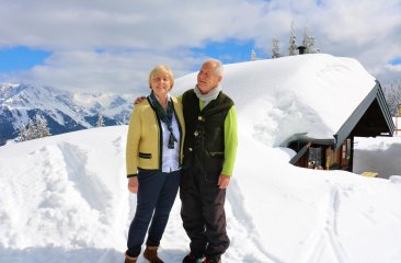 Auf der Sonnenterrasse der Hütte trifft man viele Einheimische und Stammgäste, die Marianne und Bertram jeden Winter einen Besuch abstatten. „Wir freuen uns, dass unser kleines Angebot so gut angenommen wird. Dank der treuen Gäste können wir das überhaupt so viele Jahre machen. Und natürlich werden die Besucher vor allem von dieser wunderschönen Landschaft fast magnetisch angezogen“, meint Bertram. So hoffen ihre Stammgäste, dass die zwei Gastgeber noch lange die kleine aber feine Karhütte bewirten. „Diese Saison sind wir sicher noch hier. Je nach Gesundheit werden wir danach noch ein bisschen weitermachen“, meint der leidenschaftliche Hüttenwirt Bertram und schenkt sich und Marianne ein Schnapserl ein: „Prost - Auf die Gesundheit. Sie ist das Wichtigste!“.