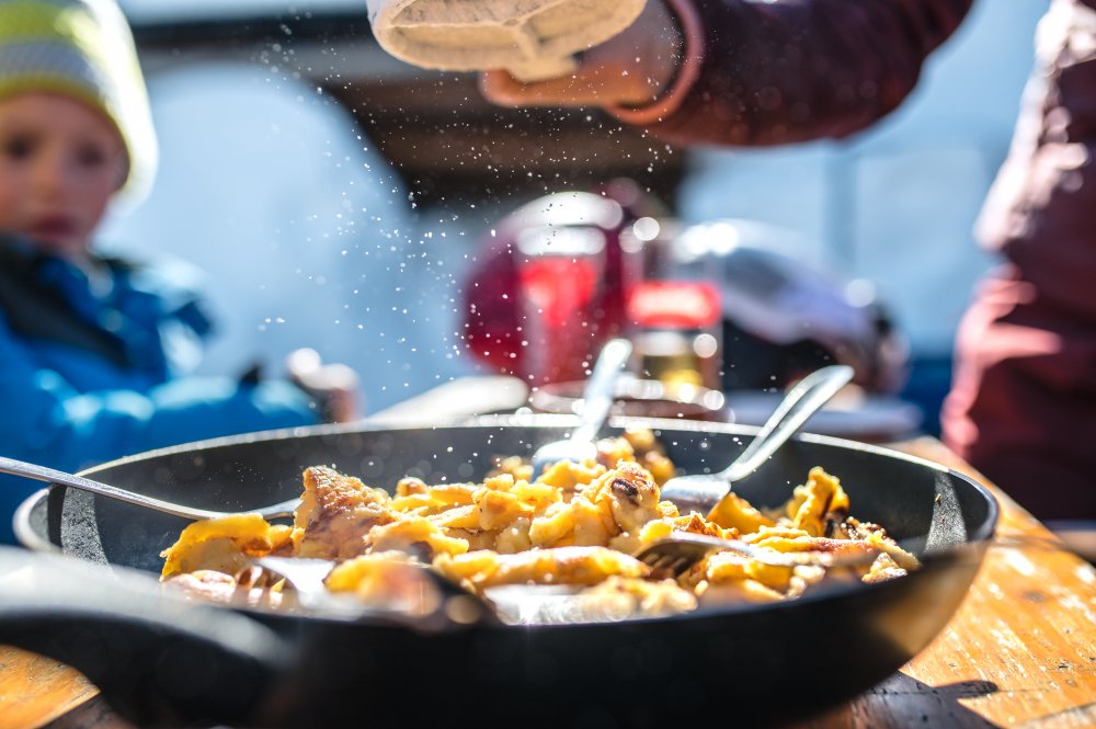 Wer früh aufsteht, wird belohnt - und zwar mit einer unberührten und frisch präparierten Piste. Zu Mittag kann man die sonnige Mittagspause auf der Hütte im T-Shirt genießen. Wie herrlich ist es, wenn man sich Kasnocken oder Apfelstrudel mit Vanillesauce auf der Sonnenterrasse schmecken lassen kann.