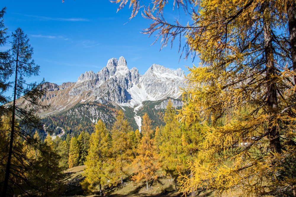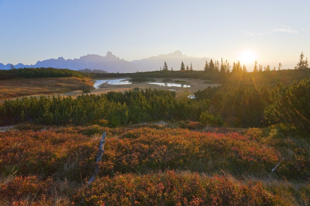 Der Sommer neigt sich allmählich dem Ende zu und Filzmoos leuchtet in kräftigen Herbsttönen. Die Lärchen leuchten golden und die Fernsicht am Berg erscheint endlos.