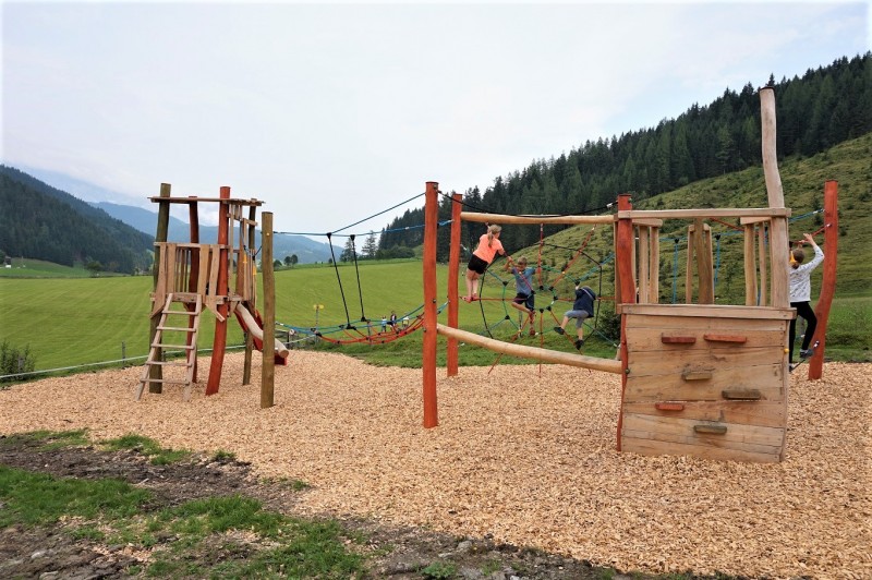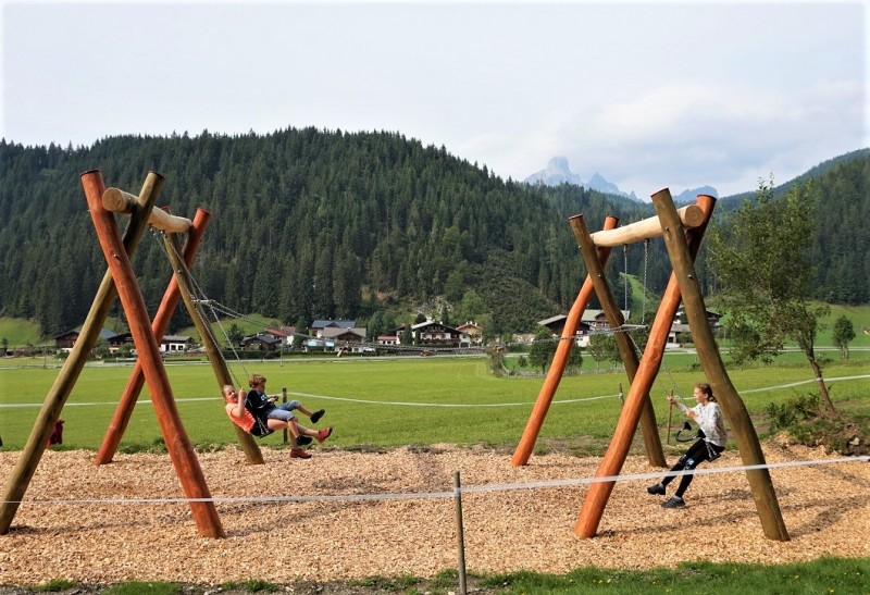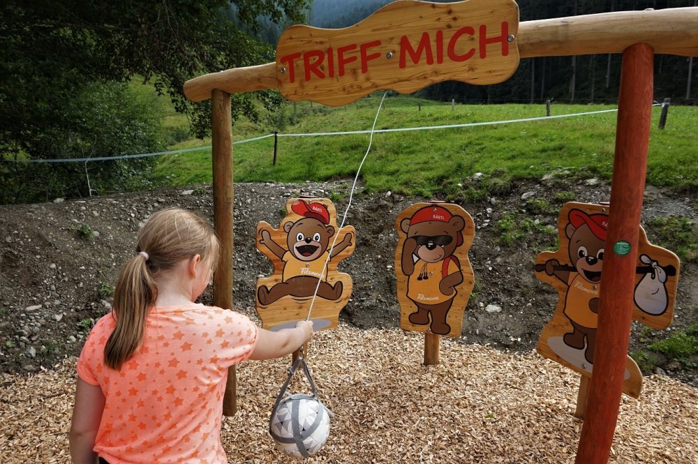 Weiter geht es zu den Stationen des Bärtls Familienwanderweges. Wir wandern entlang dichter Wälder, über saftige Wiesen. Bei den verschiedenen Stationen kann sich Isabel austoben. Die Stationen eignen sich zum Balancieren, Klettern und Schaukeln. Doch das war noch nicht alles. Beim Weitwurf, auf der Stehwippe oder am Klettergarten hat die Kleine besonders viel Spaß.