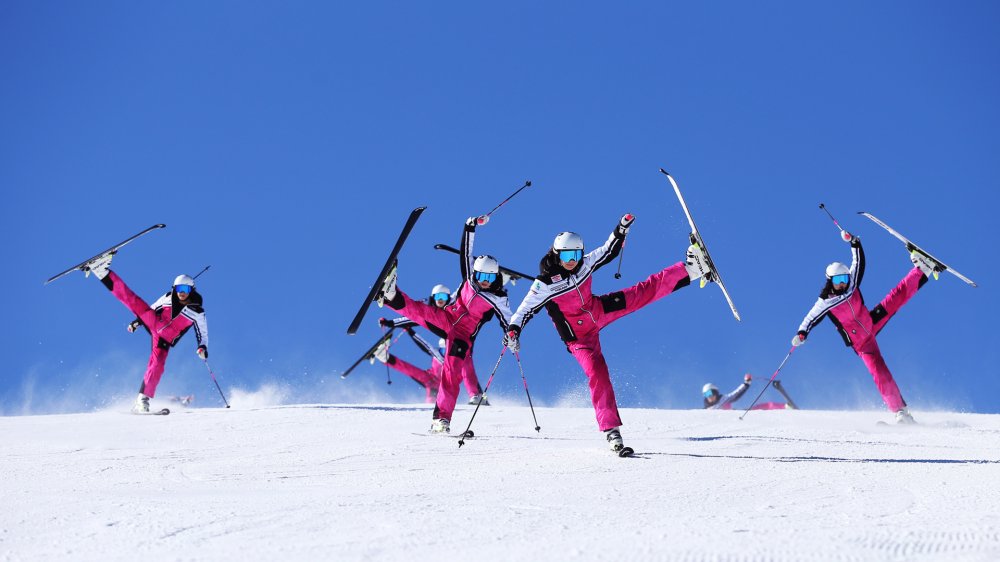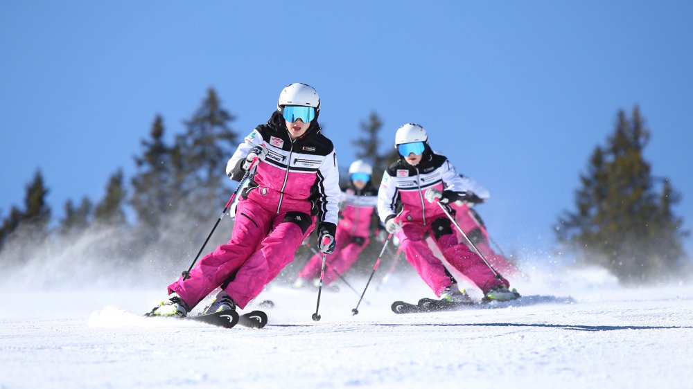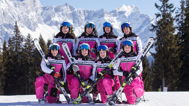 Ihr kennt die Girlies nicht? Sie sind die flotten Mädels im pinken Partnerlook, die synchron in Formation die Piste runterwedeln. Boah, wie cool das ausschaut!! Die jungen Damen Selina, Viola, Eva, Emily, Maria, Anja, Julia & Leonie – alle im Alter vom 15 bis 18 Jahren – fahren seit 2013 gemeinsam als „Girlie-Team“.