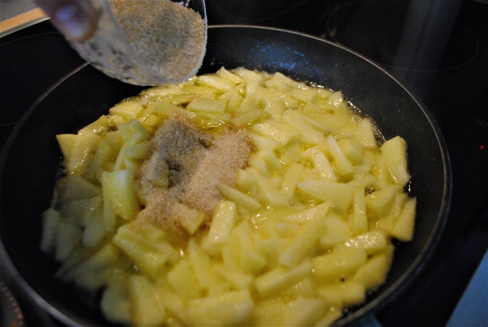 - Für die Füllung zwei Äpfel schälen, entkernen und klein schneiden. Butter in einer Pfanne schmelzen. Äpfel bei mittlerer Hitze ca. 8-10 Minuten anbraten. Nach der Hälfte der Zeit Zucker hinzufügen und karamellisieren lassen.