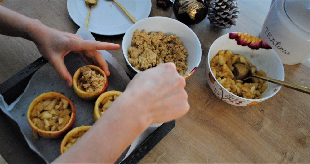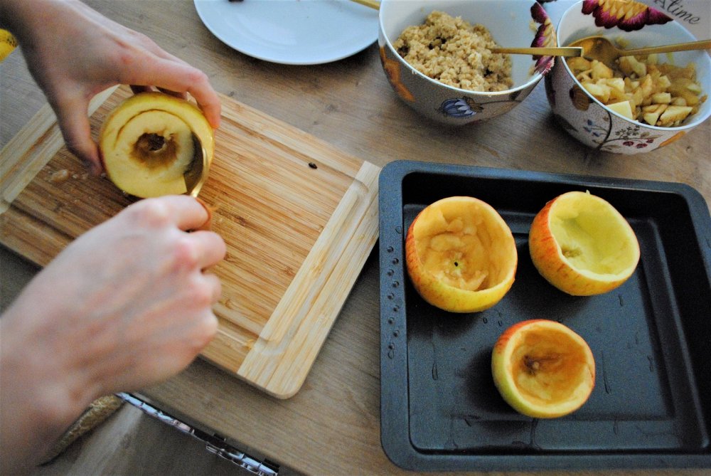 - Deckel der restlichen Äpfel abschneiden und beiseitestellen. Mit einem Löffel Kerngehäuse und Fruchtfleisch entfernen. Ausgehöhlte Äpfel zu 2/3 mit karamellisierten Apfelstückchen füllen und mit Crumble bedecken. Im heißen Ofen ca. 20 Minuten backen.