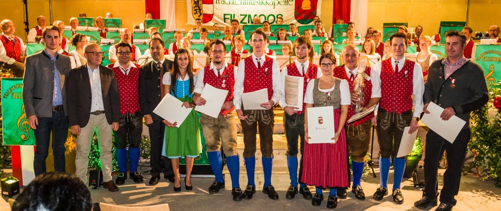 Letzten Samstagabend fand das Cäcilia Konzert der Trachtenmusikkapelle Filzmoos in der Mützenhalle zu Ehren der heiligen Cäcilia, Patronin der Kirchenmusik, statt. Unter der musikalischen Leitung von Sigi Posch wurde ein äußerst anspruchsvolles und musikalisch hochstehendes Konzertprogramm dargeboten. Der Abend wurde für die vielen Besucher, darunter auch namhafte Persönlichkeiten aus Wirtschaft und Tourismus sowie Musikanten aus der Umgebung, zum musikalischen Ohrenschmaus. Mit großer Freude konnte beobachtet werden, dass auch viele junge Musiker, die vom Musikschulwerk bestens ausgebildet werden, aktiv in der Trachtenmusikkapelle Filzmoos tätig sind. So wurden unter großem Applaus die Auszeichnungen an die Nachwuchs-Musikanten übergeben. Neben den exzellent spielenden Solisten der Kapelle begeisterten Chiara Schörghofer und Theresa Rettenwender mit ihren goldenen Stimmen das Publikum. Durch das Programm führte gekonnt - wie immer - Gottfried Schörghofer, Obmann der Trachtenmusikkapelle Filzmoos. Nach dem Konzert wurde direkt in der Mützenhalle für das leibliche Wohl der Konzertbesucher gesorgt. Die Pizzeria Pinocchio sowie die Unterhof- und Oberhof-Alm boten mit ihren kulinarischen Köstlichkeiten in Form eines kalten und warmen Buffets den idealen Rahmen für einen gemütlichen Verlauf des Abends.