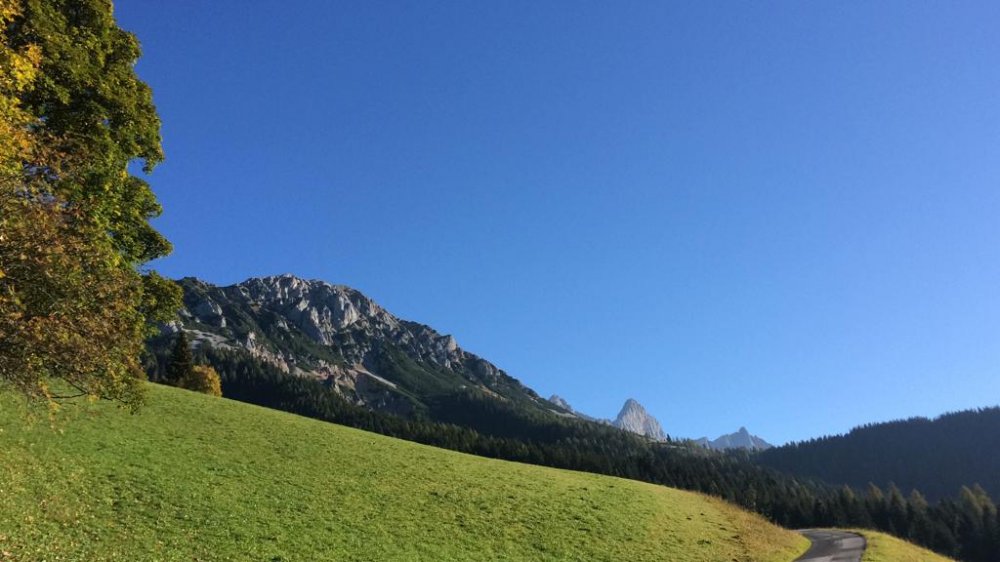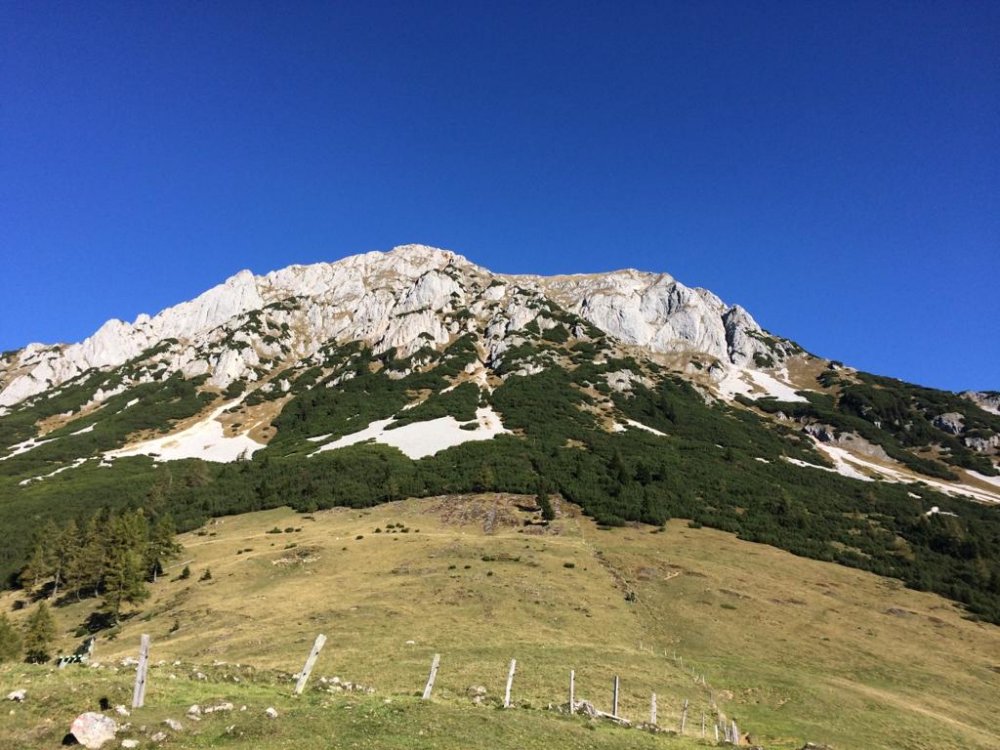 Die Sonne erstrahlt über dem Nösslerriedel und es wird wärmer. Fasziniert von der Morgensonne und dieser herrlichen Stimmung zieht es mich förmlich weiter und ich gehe stetig bergauf. Heute fällt mir das Gehen ganz leicht und ich genieße jeden Schritt, obwohl ich doch über 300 Höhenmeter überwinden muss bis zum Nösslerriedel. Schritt für Schritt steige ich bergauf. Nach gut einer halben Stunde empfängt mich ein herrlicher Ausblick am Nösslerriedel. Der Rettenstein, der Torstein, der Mitterspitz, die Dachstein-Südwand, der Dachsteingletscher mit der Bergstation und der Koppenkarstein leuchten in der Morgensonne ganz nah. Ich setze mich auf eine Bank und genieße den Ausblick und die wunderbare Ruhe. Kein einziger Mensch ist mir bislang begegnet. Am Fuße des Rettensteins entdecke ich jemanden - es ist ein Bauer, der den Zaun für den Winter ablegt.