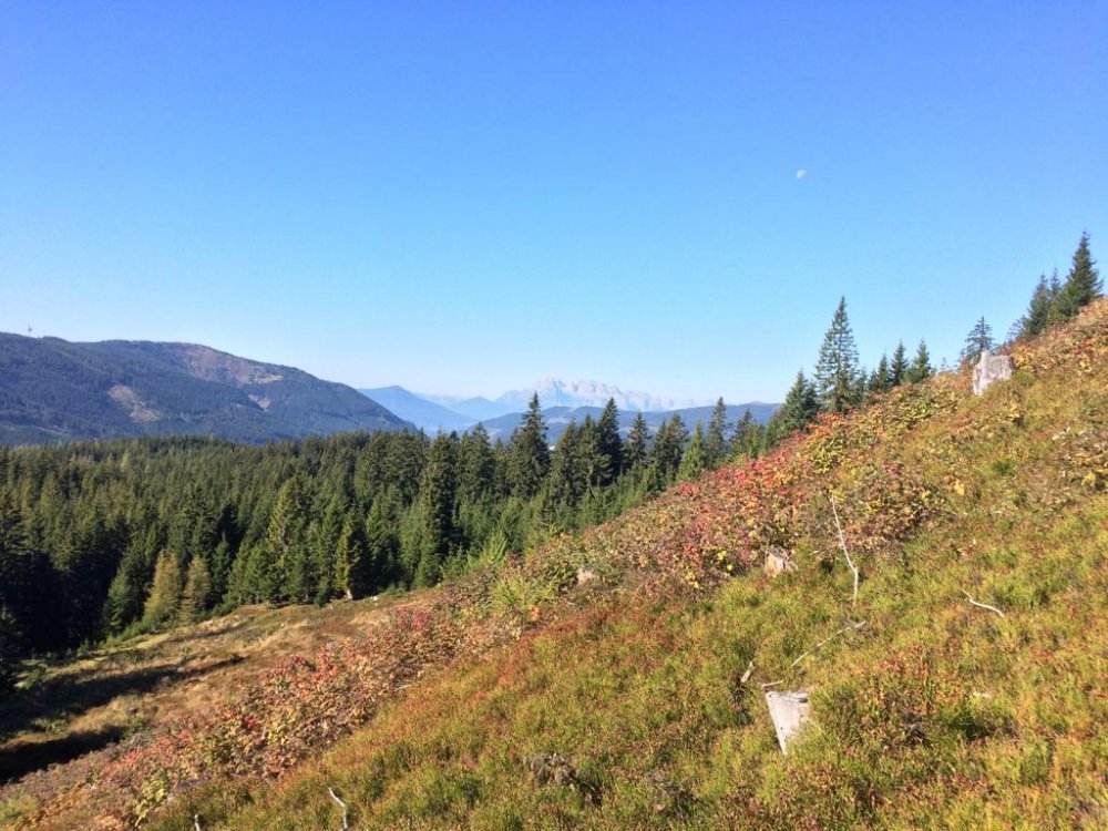 Drehe ich jetzt um oder gehe ich weiter? Nein, es ist so traumhaftes Wetter und das Gehen fällt mir heute leicht, ich wandere weiter Richtung Bachlalm. Also gehe ich querfeldein (soll man zwar nicht, im Herbst ist es jedoch nicht so schlimm, da keine Kühe mehr auf der Alm sind) und gelange zum Naturlehrpfad der Bachlalm, dort zweige ich ab und marschiere weiter zur Filzwiese. Diesen Weg bin ich schon sehr, sehr lange nicht mehr gegangen. Er ist wunderschön. Ein schmaler Steig, wie ich ihn liebe, führt durch den Wald und quert steile Hänge und ein paar Gräben. An einem Hang zwischen schon rötlich gefärbten Schwarzbeersträuchern entdecke ich ganz große dunkelrote Preiselbeeren. Mmmh, schmecken die gut und sind nebenbei so gesund. Immer mehr finde ich, Gott sei Dank habe ich ein kleines Sackerl mit. Also fange ich gleich an, die Preiselbeeren zu pflücken. Ich liebe Preiselbeermarmelade zum Wiener Schnitzel, eigentlich esse ich sie zu fast allen Fleischgerichten.