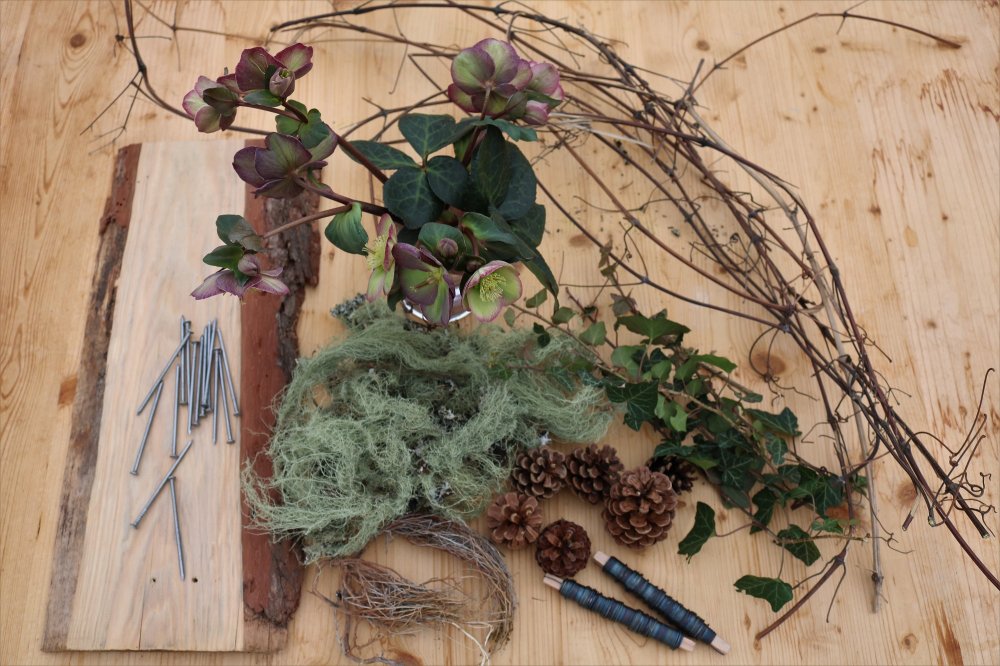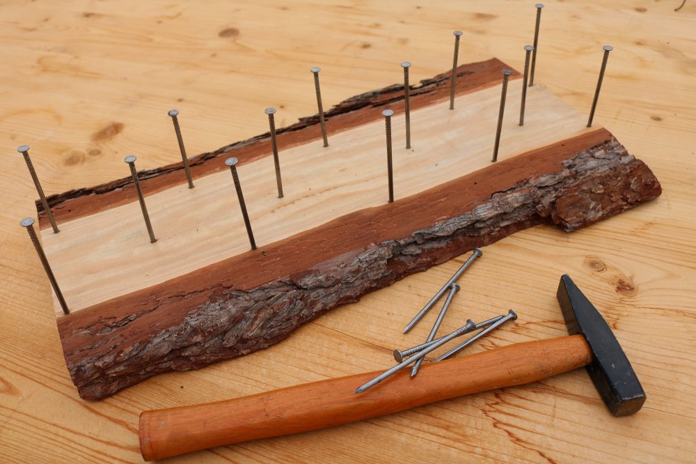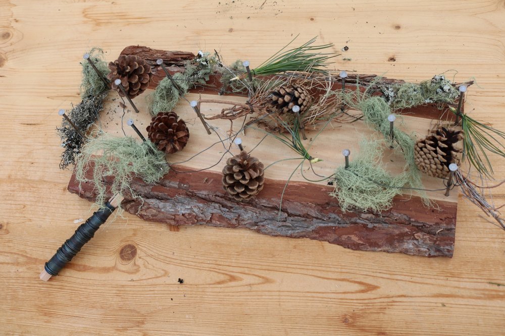 Als ersten Schritt werden die Nägel in das Brett vorsichtig eingeschlagen, wobei dies nicht wahllos geschehen sollte. Am besten ist es, drei Reihen anzulegen und die Nägel in jeder Reihe versetzt anzuordnen. So wird das Umwickeln der Nägel später einfacher. Nun nimmt man den Bindedraht zur Hand und beginnt, einen ersten Zapfen damit zu umwickeln. Der Draht wird nicht abgeschnitten, sondern eine zusammenhängende Draht-Kette erstellt. Man lässt ein paar Zentimeter Draht frei und nimmt ein bisschen Moos als nächstes Element für die Kette. Wenige Zentimeter weiter dürfen Latschennadeln ihren Platz auf diesem langen Stück Draht finden. Und so fixiert man die einzelnen Materialien nach und nach auf der Draht-Kette. Am besten sämtliche Utensilien abwechselnd fixieren, damit später am Holzbrett eine schöne und bunte Dynamik entsteht.