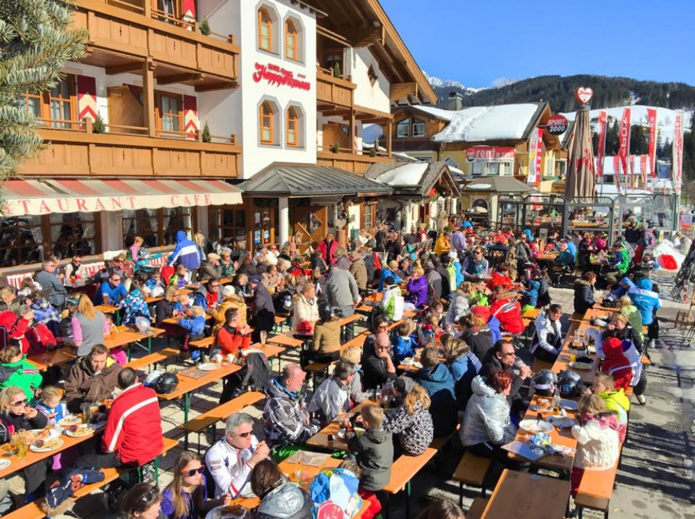 Die großzügige Terrasse und die schöne Lounge-Atmosphäre laden vor allem im Sommer zum Dinieren im Freien ein. Aufgrund der idealen Lage bietet es sich an, auch nachmittags kurz im Happy vorbeizuschauen um einen Kaffee oder Sommer-Spritzer zu genießen. Im Winter schätzen müde Skifahrer die Sonnenterrasse mitten im Ort. Für alle Wintergäste die es etwas rasanter lieben, öffnet die Happy Alm und auch die Schirmbar zum Aprés Ski und Abfeiern ihre Türen. Erwähnenswert hierbei ist sicherlich das gebotene Programm: die sprechende Kuh Resi, der jodelnde Seppl und ein eigener DJ sorgen für perfekte Party-Stimmung und heizen den Gästen selbst an kalten Wintertagen so richtig ein! Bei diesem Rund-um-Paket im Happy Filzmoos kann man nur „happy“ sein!