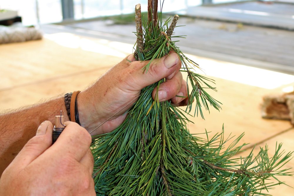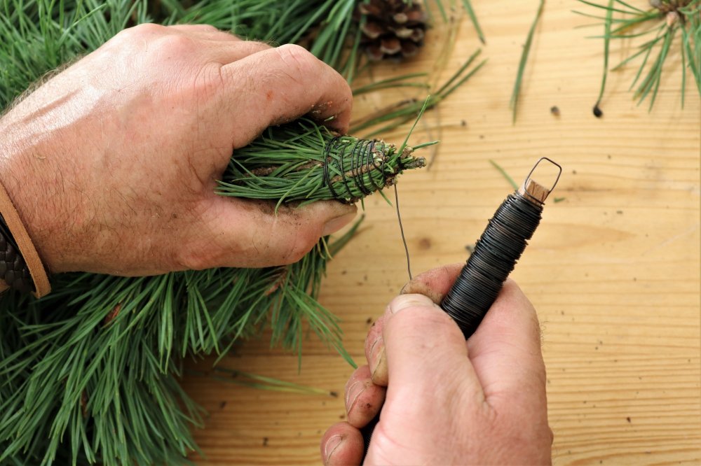 Am besten mit Handschuhen arbeiten, um sich vor dem austretenden Harz zu schützen. Wählt einen Standort im Freien, denn dann ist das gebundene Bäumchen den ganzen Winter problemlos haltbar. Ebenso ist es möglich, diese schöne Winterdekoration im Innenbereich zu platzieren. Dann muss man aber damit rechnen, dass das Bäumchen nach etwa zwei bis drei Wochen eintrocknet. Von der Größe her sind kein Grenzen gesetzt: Man kann ein ganz kleines Bäumchen binden oder einen ganz großen Baum für den Eingangsbereich basteln. Jedenfalls ist diese Dekoidee auch bestens für Weihnachten oder als Mitbringsel geeignet, wobei man es dann erst kurz vorher binden soll.