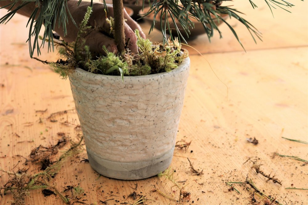 Zunächst nimmt man den Stab und schätzt ab, wie weit dieser in Proportion zum Gefäß ohne die darauf gebundenen Zweige herausstehen soll. Dann legt man den ersten Zweig auf den gewählten Ausgangspunkt und befestigt ihn mit etwas Draht am Stab. So geht das Reihe für Reihe weiter. Am besten man fängt mit den längsten und stärksten Zweigen an und verwendet nach oben hin immer kürzere und feinere Zweige. Wer an der „Baumspitze“ angekommen ist, umwickelte diese mehrmals fest mit Draht, um einen kompakten Abschluss zu bilden. Nun wird das Gefäß mit Moos ausgestopft und das Bäumchen hineingesteckt. Es darf schon einiges an Moos verwendet bzw. der Topf zusätzlich mit Steinen zum Beschweren gefüllt werden – das Bäumchen soll immerhin sicher stehen bleiben. Nun nimmt man den Wollfaden, um den Abschluss damit spiralförmig zu verdecken. Die kleine Haube, die das Bäumchen aufgesetzt bekommt, klebt man zusätzlich mit der Heißklebepistole fest. Nun kann nach Belieben mit Zimtstangen, Nüssen, Zapfen, Äpfeln oder auch Kugeln dekoriert werden.