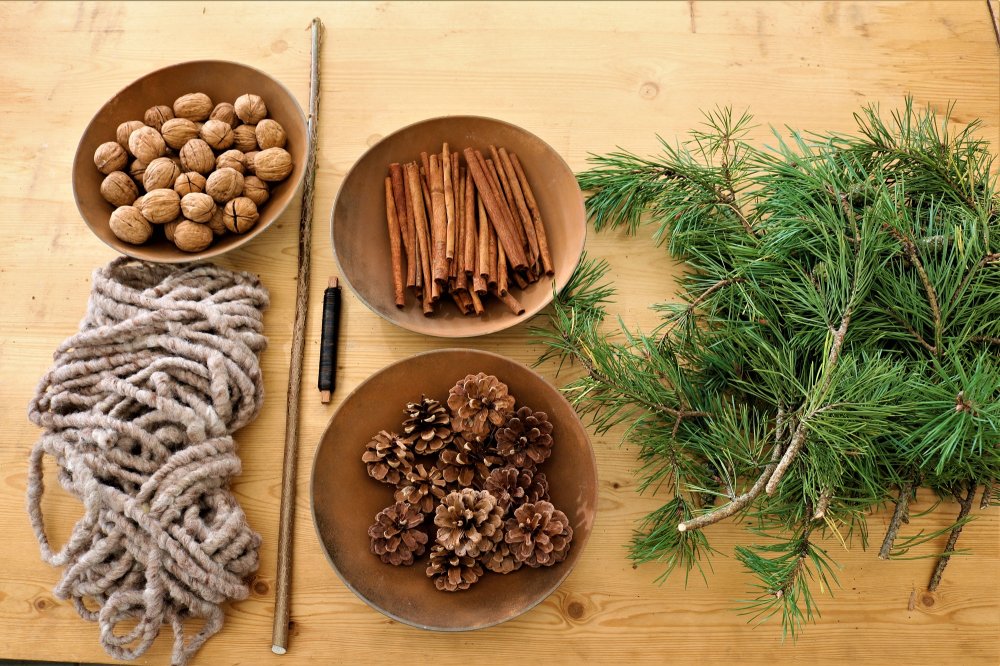 Alles was man dazu benötigt sind ein paar Zweige von der Kiefer oder Fichte, einige Meter Bindedraht, eine Baumschere, ein Gefäß aus Ton oder Blech, Wollfaden sowie etwas Moos aus dem Wald. Zu guter Letzt braucht man einen Stab zur Befestigung – entweder von einem Haselnussstrauch oder von einer Weide. Und natürlich dürfen Dekomaterialien wie Zapfen, Nüsse, Zimtstangen oder Äpfel nicht fehlen.