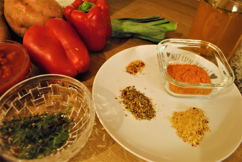 -Süßkartoffeln und Paprika in große Stücke schneiden und in die Pfanne geben, Paprikapulver und eingelegte Tomaten nach 2-3 Minuten zugeben, mit den Aromaten würzen und mit Fond aufgießen.