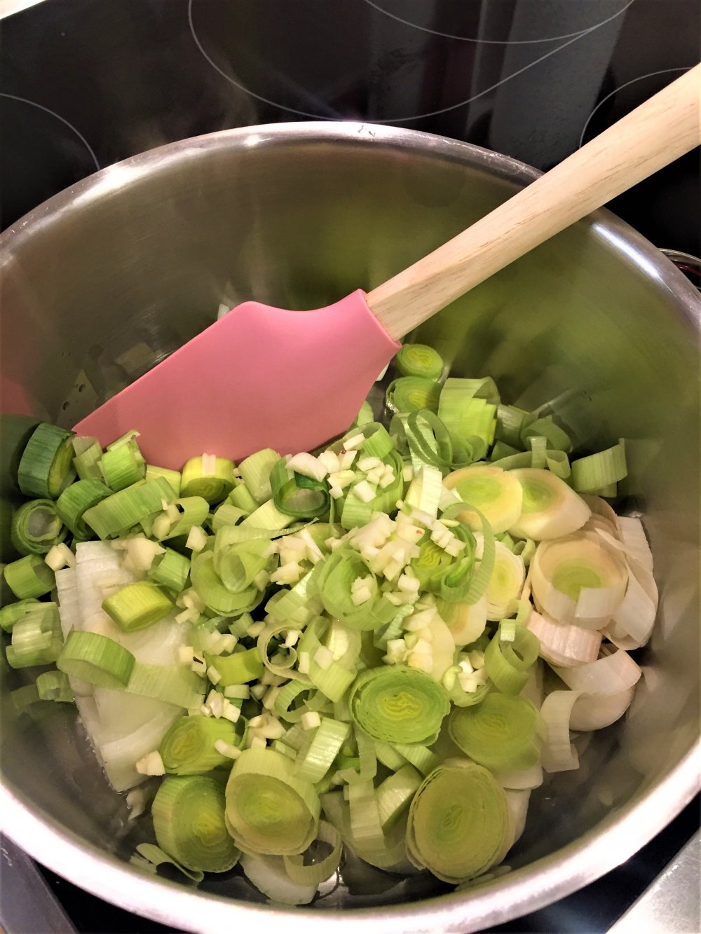 -Öl in einer Pfanne erhitzen, Zwiebel, Lauch und Knoblauch zugeben und ca. 4 Minuten köcheln lassen.