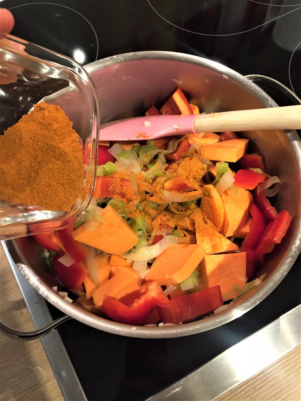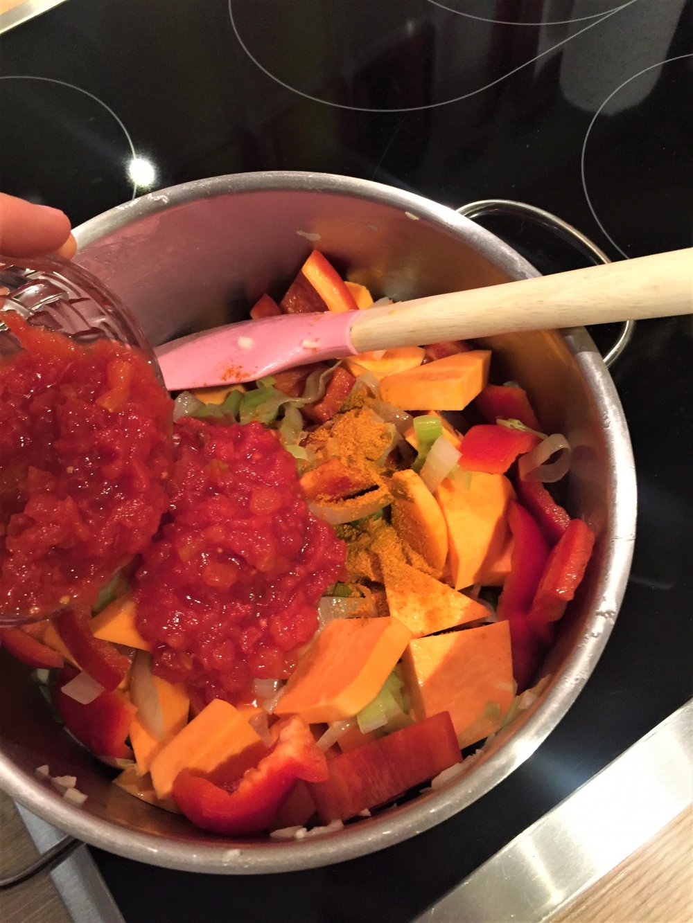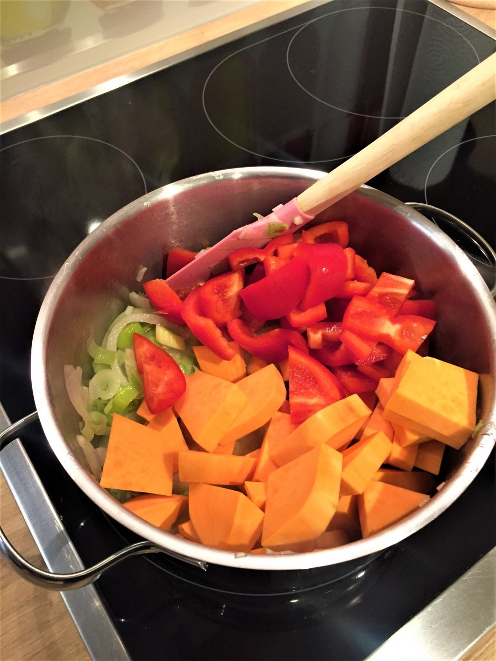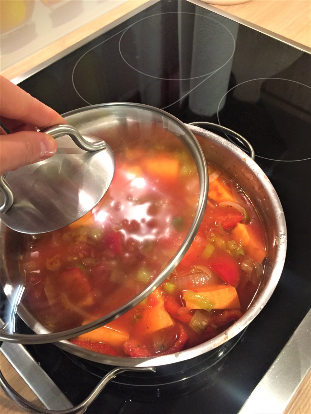 -Bei mittlerer Hitze ca. 20 Minuten köcheln lassen, bis die Süßkartoffeln weich sind. Eventuell etwas Flüssigkeit nachgießen.
