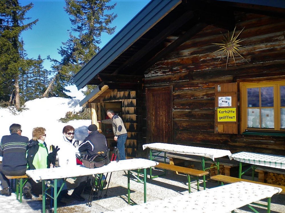 Spaziergängern wird hingegen gutes Schuhwerk und Sonnenschutz empfohlen. Und für alle Besucher der Höhenloipe gibt es auf halbem Weg eine tolle Einkehrmöglichkeit: Die Karhütte lädt in idyllischer Landschaft und Ruhe zum Verweilen und Erholen ein. Familie Simonlehner bewirtschaftet die kleine und urige Hütte und hat einfache aber sehr leckere Gerichte als Stärkung auf der Speisekarte. Am besten, man sichert sich möglichst bald einen der wenigen Plätze direkt an der Sonne und genießt die letzten Wintertage im Frühling 2019 bei einem unvergesslichen Besuch auf der Karhütte!