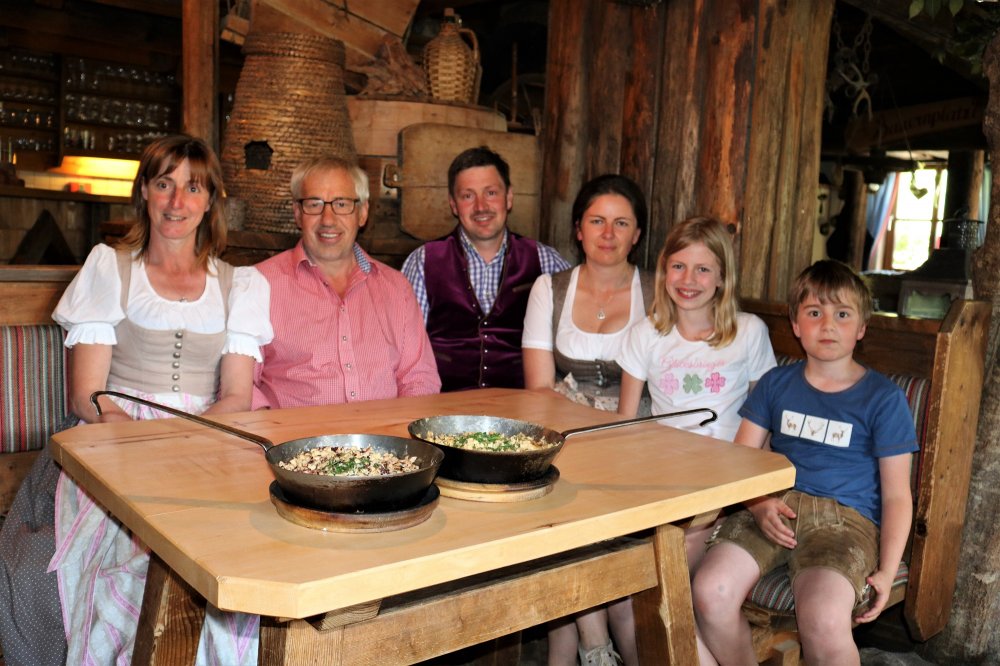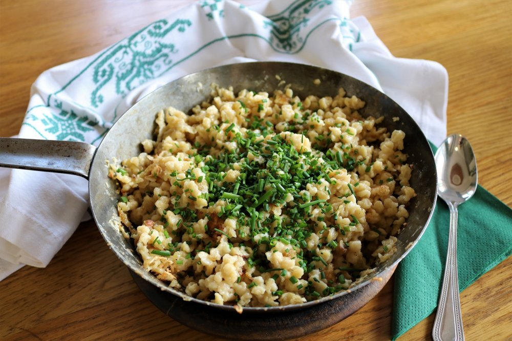 Zubereitung: Butter in eine Eisenpfanne geben, die Hälfte der Spätzle in die heiße Pfanne geben, 150 g Nocknkäse (gerieben) hineinstreuen, mit Salz und Pfeffer sowie Gartenkräutern würzen. Marias Geheimtipp: Die Kasnocken in der Pfanne so anbraten, dass sich eine schöne Kruste am Boden bildet. Diese Kruste – auch „Prinzn“ genannt – abkratzen und untermengen. Durch diesen Vorgang erhält man das typische Kasnockn-Aroma! Am Schluss nochmal gut durchrühren, mit frischem Schnittlauch bestreuen und in der Pfanne servieren. Als Beilage empfehlen die Köchinnen von der Gsenghof-Alm einen grünen Salat.