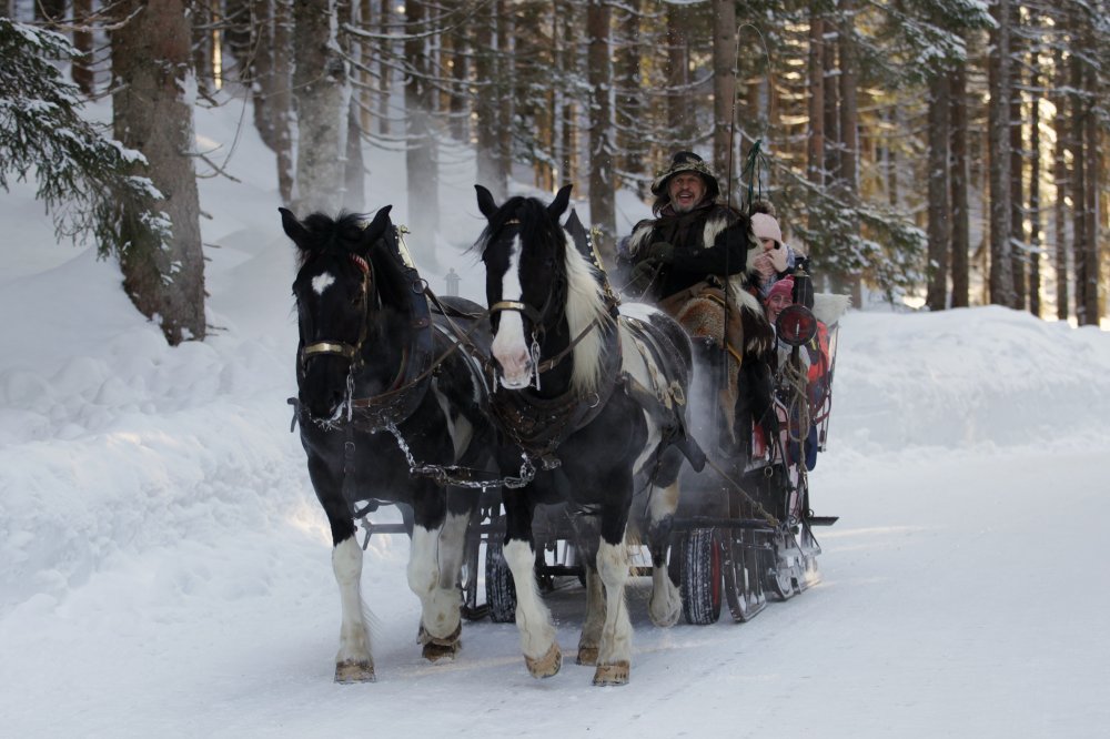 Ein ebenso unvergessliches Erlebnis ist eine Pferdeschlittenfahrt zur Hofalm. Einzig das Schellen der Schlittenglocken und das Schnauben der Pferde durchdringt die winterliche Stille. Die Fahrgäste sind warm eingepackt und genießen das beschauliche Dahingleiten durch den verschneiten Winterwald.