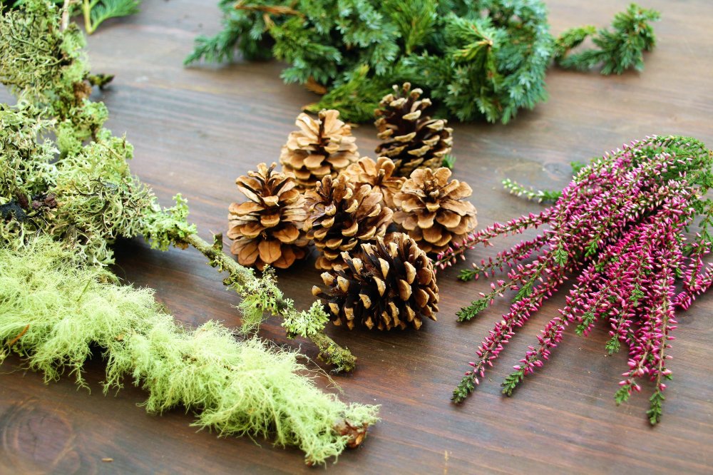Einige Materialien für den Kranz findet man direkt im eigenen Garten oder im nächstgelegenen Wald. Am besten man arbeitet mit verschiedenen Zweigen wie beispielsweise von der Tanne, der Blauzypresse und vom Wacholder. Im Türkranz am Bild sind dazu noch etwas Erika, ein paar Flechten und Zapfen eingearbeitet. Zudem benötigt man einen Strohreifen, Basteldraht, eine Haushalts- oder Gartenschere und ein paar Dekorationsbänder.