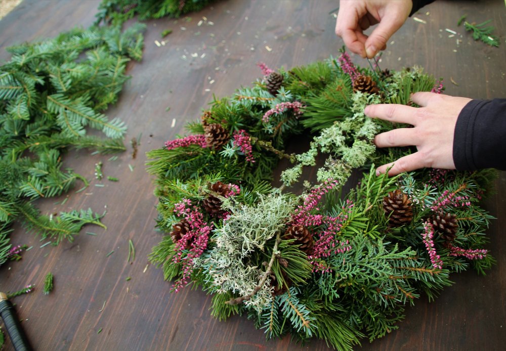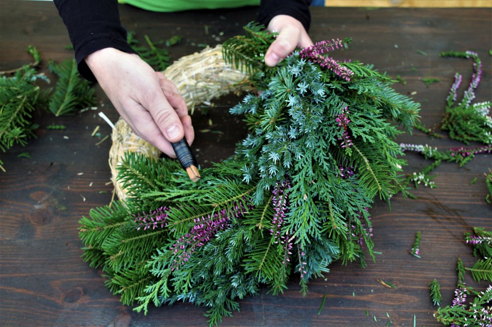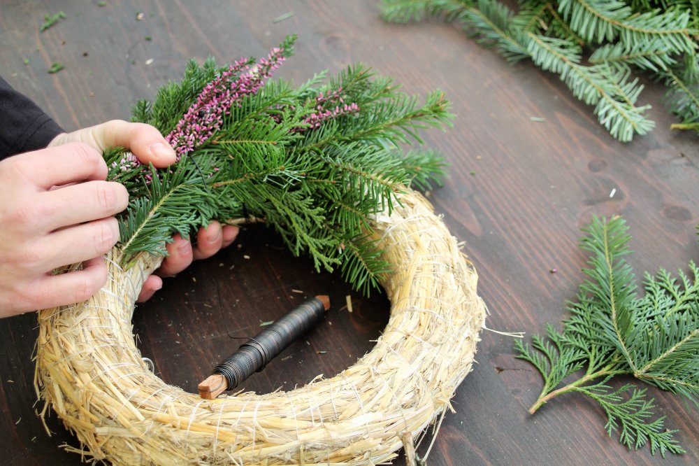 Dann kann es auch schon losgehen: Als ersten Schritt nimmt man den Strohreifen zur Hand und umwickelt ihn an einer Seite zweimal mit Draht. Dann nimmt man aus dem Nadelgrün ein kleines Büschchen Zweige und legt diese auf den Draht am Strohreifen. Das Ende der Zweige umwickelt man anschließend erneut zweimal fest mit dem Draht. So geht man Reihe für Reihe vor. Am besten gegen den Uhrzeigersinn wobei man für die Außenseite des Strohreifens lange Zweige verwendet und für die Innenseite eher kürzere. Die verschiedenen Materialien können abwechselnd und nach Belieben eingearbeitet werden. Wichtig ist, die einzelnen Elemente gut mit Draht zu befestigen. Der letzte Draht, der zum Umwickeln der abschließenden Reihe verwendet wird, muss fein säuberlich angedreht und in den Strohreifen gesteckt werden. Am Ende befestigt man Zapfen und andere Dekorationsmaterialien sowie ein Band zum Aufhängen – dabei sind der Kreativität keine Grenzen gesetzt!