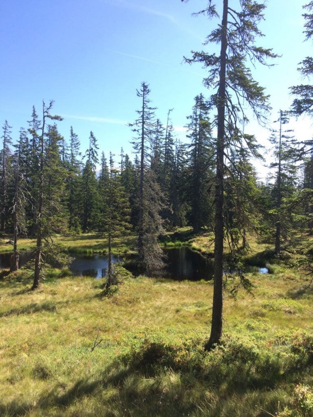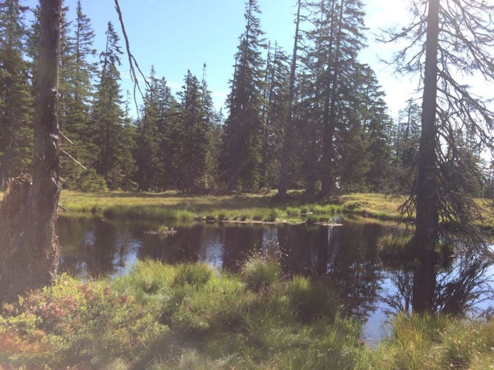 Bei der Weggabelung entscheide ich mich für den sogenannten Wurzelweg Richtung Moserscharte. Immer wieder eröffnen sich mir wunderschöne Ausblicke auf das Ennstal, die Niederen und Hohen Tauern und das Dachsteinmassiv. Damit man im Hochmoor nicht allzu sehr einsinkt, sind an den besonders nassen Stellen immer wieder Holzpflöcke mit Brettern (schauen aus wie liegende Leitern) in den Weg eingearbeitet. So ein Hochmoor ist wirklich etwas Besonderes. Ich entdecke wunderschöne Libellen, kleine Spinnennetze mit leuchtenden Wasserperlen, Latschen und Schwarzbeersträucher. Fasziniert bleibe ich vor einem Moorsee stehen. Mitten im See steht eine alte, abgestorbene Lerche, rundherum ist Wollgras, Libellen schwirren herum und die Sonne glitzert in den kleinen Wellen. Ich setze mich auf die Bank und versinke in eine Märchenwelt mit Feen, guten Geistern und Zwergen, die um mich herumschwirren. Nach meinen Träumereien kehre ich wieder in die Wirklichkeit zurück und wandere weiter Richtung Moserscharte.