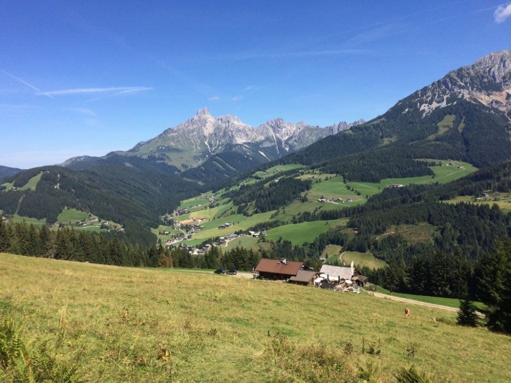 Kurz oberhalb der Moosalm, wenn man aus dem Wald herauskommt, erwartet mich schon wieder ein wunderschöner Ausblick auf Filzmoos, die Bischofsmütze, den Rettenstein und das Dachsteinmassiv.
