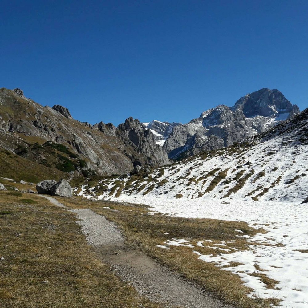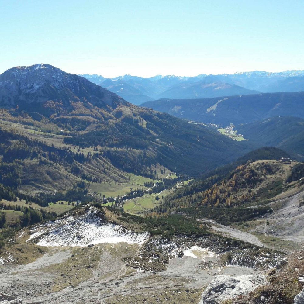 Danach wird ein Latschenhang bis zur nächsten Wegverzweigung angestiegen, wo ich den Linzer Weg nach links verlasse und das Geröllkar auf einfachem Wanderweg überwinde. Dieser breite Pfad geht nun westlich des Steiglkogels über mehrere Felsstufen zum Steiglpass hinauf. Einige Felspartien sind dabei seilgesichert – was mir beim Antreffen von erstem Schnee ein sicheres Gefühl gibt. Nach weiteren 1,5 Stunden am Steiglpass auf 2015 Metern Seehöhe angekommen, gibt es ein herrliches Panaroma mit Blick auf die umliegenden Berggipfel als Belohnung. Nach einer kurzen Pause geht es zurück nach unten. Ich nehme den gleichen Serpentinenweg vom Steiglpass zurück zum Linzer Weg, von welchem aus ich Richtung Rinderfeld wandere. Hier bin ich großteils auf einem wunderschönen Höhenwanderweg unterhalb des Gosausteins mit grünen, saftigen Matten, sanften Hügeln und freier Sicht zu den Hohen Tauern unterwegs. Vom Rinderfeld aus nehme ich die Abzweigung Richtung Hofalmen – ab hier geht es für ca. 45 Minuten abwärts bis zum Almsee. Danach endete meine Tour beim Ausgangspunkt auf der Unterhofalm. Eine perfekte Wanderrunde, für alle, die den goldenen Herbst von seiner schönsten Seite genießen möchten! (Gesamtgehzeit: 3,5 – 4h)