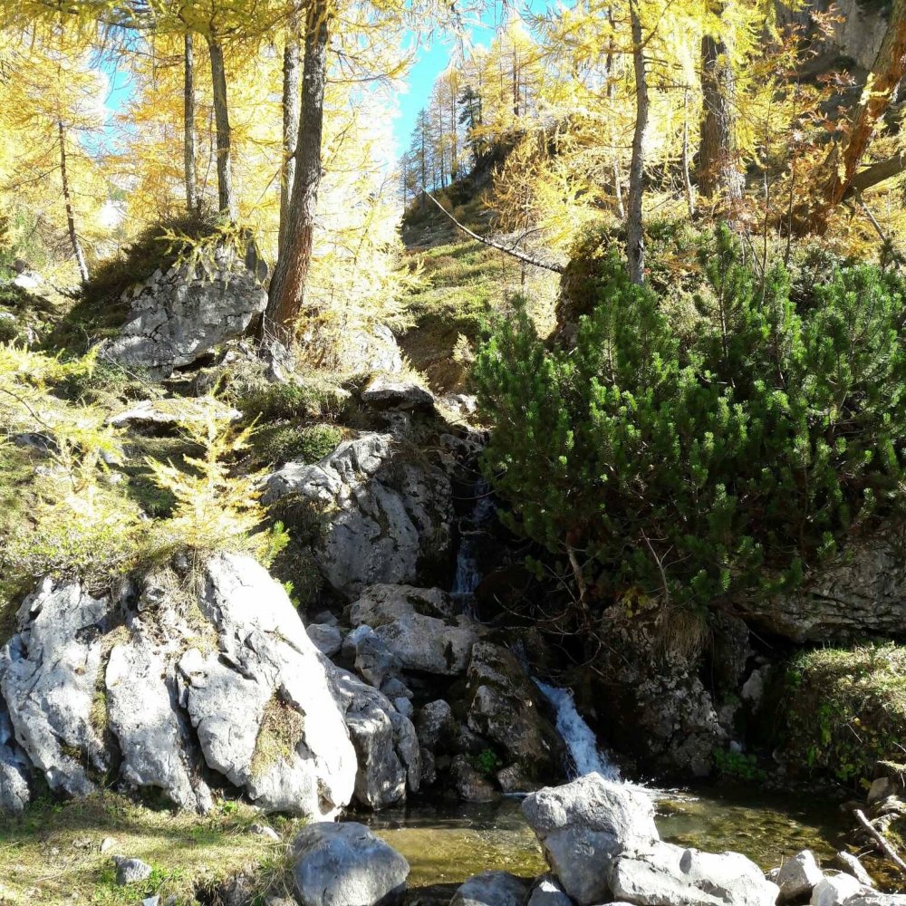 Bei herrlichem Sonnenschein und sommerlichen Temperaturen beschließe ich Mitte Oktober auf den Steiglpass zu wandern. Schließlich gibt es für mich keine schönere Zeit als den goldenen Herbst, um in Filzmoos und der Region zu wandern. Erst geht es mit dem Auto auf der Mautstraße zur Unterhofalm. Von dort aus startet der Fußmarsch über den Wastl-Lackner-Steig hoch zur Hofpürglhütte auf 1703 Metern Seehöhe. Der Weg führt erst über eine Almwiese und dann auf weichem Waldboden serpentinenartig durch die Latschen bis man nach etwa einer Stunde Gehzeit knapp vor der Hofpürglhütte rechts auf den Linzer Weg abzweigen muss. In leichtem Gefälle gelange ich in den Kesselboden zwischen Bischofsmütze und Armkarwand hinunter. Der Ausblick ist bereits hier herrlich: Die Bischofsmütze, der Gosaukamm, der Rettenstein und eine herbstliche Landschaft in sanften Gelb- und Brauntönen verzaubern meine Sinne.