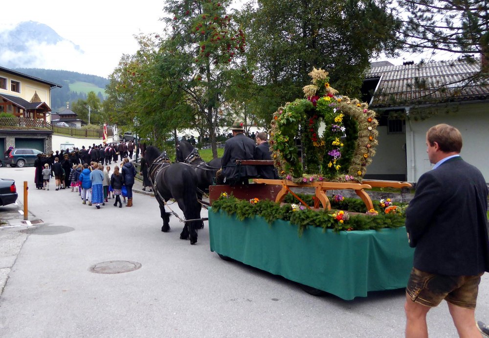 Ein weiteres traditionelles Fest im Rahmen des Bauernherbstes ist das Filzmooser Erntedankfest, welches heuer am Sonntag, dem 24. September um 07:45 Uhr stattfinden wird. Eine Erntekrone, die mit viel Geschick und Liebe von den Bäuerinnen des Ortes gebunden wird, kommt auf einen - schön mit Blumen und Feldfrüchten geschmückten - Wagen und wird von majestätischen Friesenpferden zur Pfarrkirche gebracht. Beim Festgottesdienst wird die Erntekrone gesegnet. Ein wahrer Augenschmaus sind dabei die Filzmooser Frauen in ihrer traditionellen Pongauer Tracht – dem „Austerrock“ oder auch „Überrock“ genannt.