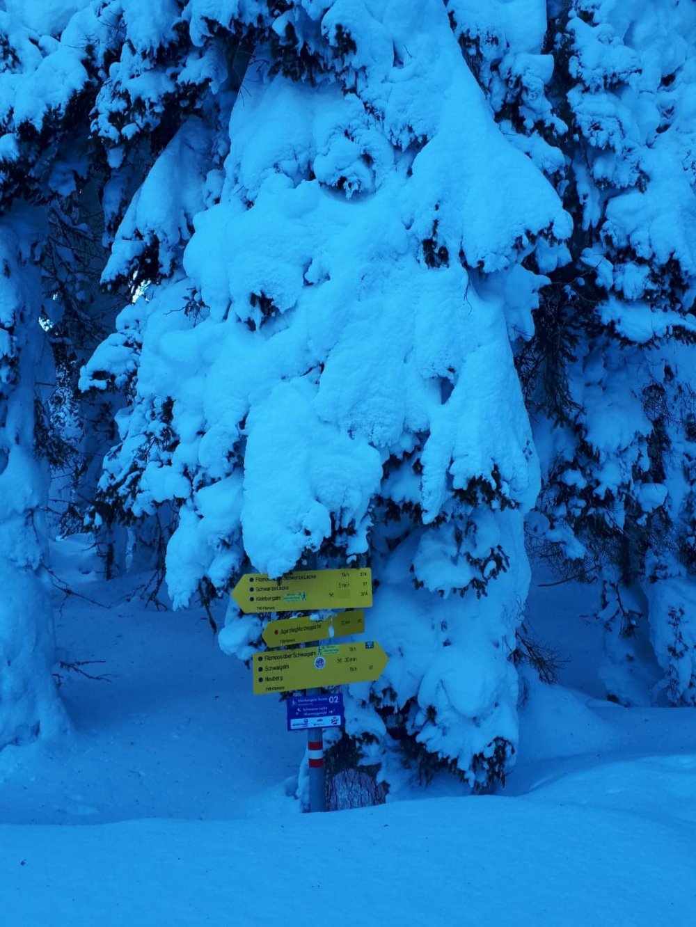 Wer Ruhe sucht und die Natur abseits von Lärm und Trubel genießen möchte, der fühlt sich auf diesem Weg ganz besonders wohl. Ich sehe zwar anhand der Spuren im Schnee, dass ich nicht die erste bin, die heute hier entlang spaziert, doch ich treffe keine Menschenseele. So lasse ich meine Seele baumeln und merke, wie mein Kopf frei wird. Ich erfreue mich an den in der Sonne glitzernden Schneekristallen und staune mehrmals über die ungeheure Schneemenge, die an den Bäumen links und rechts des Weges lastet. Die Wipfel der Bäume werden von der Sonne beschienen und sind daher teilweise schon schneefrei, aber der Rest ist im Schatten und der Schnee haftet fest an Ästen und Stamm. Eine derart unberührte Winterlandschaft sieht man selten. Während ich gedankenverloren dahinstapfe, läuft mir ein Eichhörnchen vor die Füße, sieht mich keck an und ist dann genauso schnell, wie es gekommen ist, wieder im Wald verschwunden.
