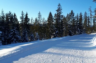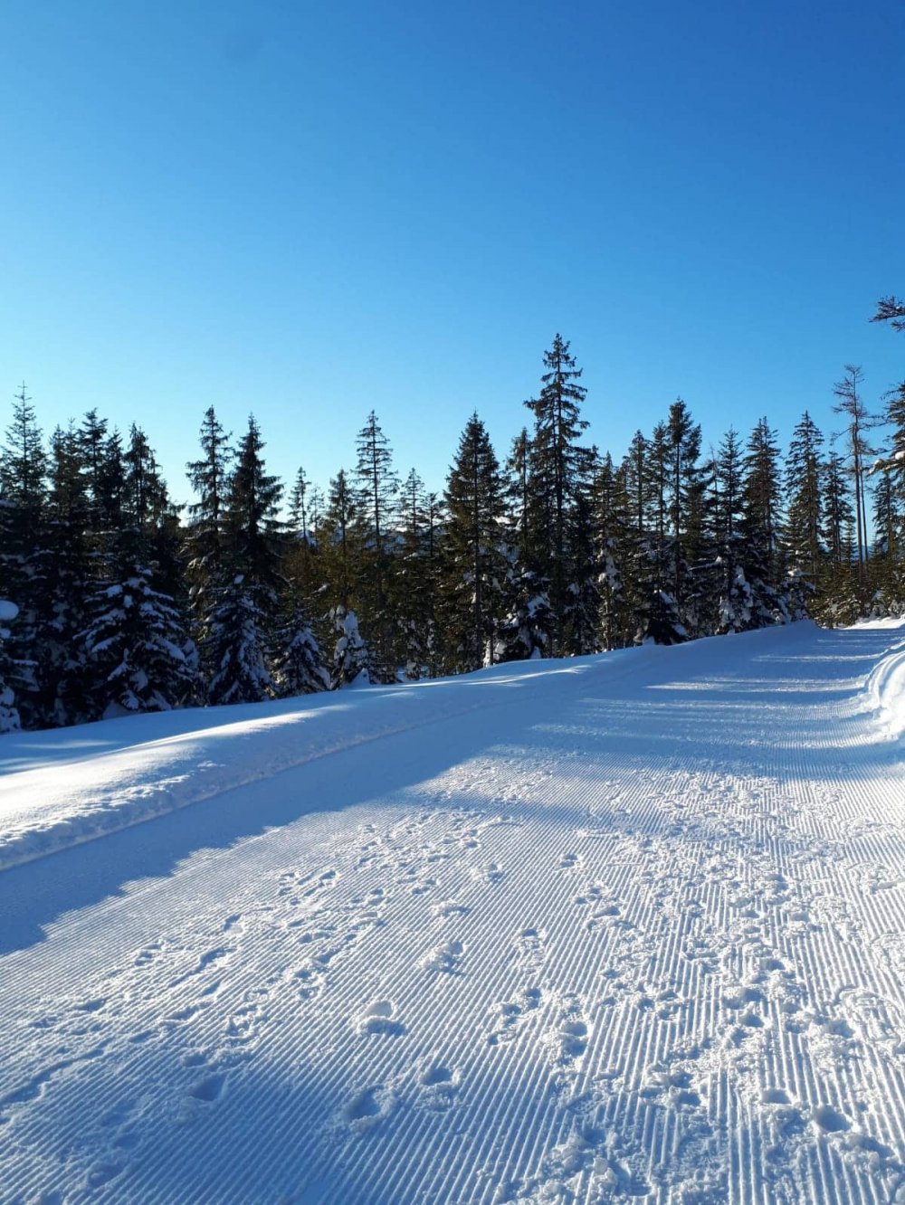 Ich lasse die Schwarze Lacke zu meiner Rechten liegen und folge weiter dem präparierten Weg, der nun leicht ansteigt. Bald gelange ich in die Nähe der Schipiste und ich vernehme in der Ferne bereits einzelne Geräusche. Immer deutlicher höre ich auch Stimmen, sodass ich weiß, dass ich gleich mein Ziel erreicht habe. Ich gehe um die letzte Kurve und sehe sie auch schon vor mir – die Kleinbergalm auf 1.380 m. Familie Vierthaler, die die Hütte besitzt, betreibt zudem eine Rodelbahn, die gleich bei der Hütte beginnt und bietet auch Leihrodeln an. Nach einem Abstecher in der Hütte beschließe ich kurzerhand, meinen gemütlichen und ruhigen Nachmittag etwas rasanter mit einer Rodelpartie ausklingen zu lassen. Gesagt, getan. Ich leihe mir eine Rodel aus und dann kann es auch schon losgehen. Die Rodelbahn Kleinberg ist ca. 2,5 km lang und ich sause flugs Richtung Tal. Nach kurzer Zeit bin ich am Ziel angelangt. „Schade eigentlich, dass es so schnell ging!“, geht mir durch den Kopf.