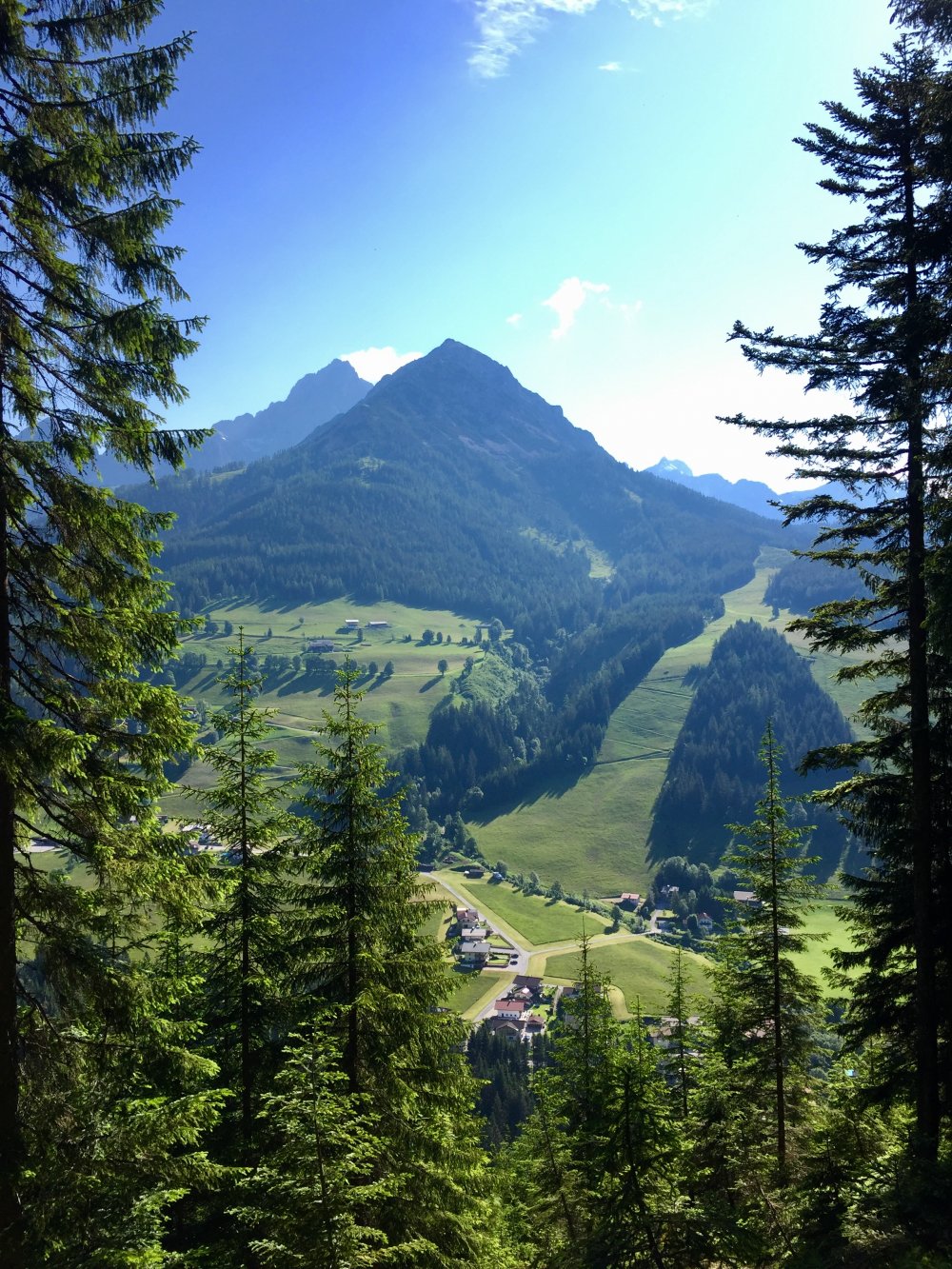 Ich starte am Dorfplatz in Filzmoos, wo ich die Straße überquere und über die Brücke zum Hotel Bischofsmütze gehe. Links vom Hotel aus führt ein schmaler und steiler Steig über den „Toleranzberg“ ca. 15 Minuten hinauf bis zum Haus Fritzenwallner. Hier oben angelangt genieße ich erstmal den herrlichen Ausblick auf das Dorfzentrum von Filzmoos.