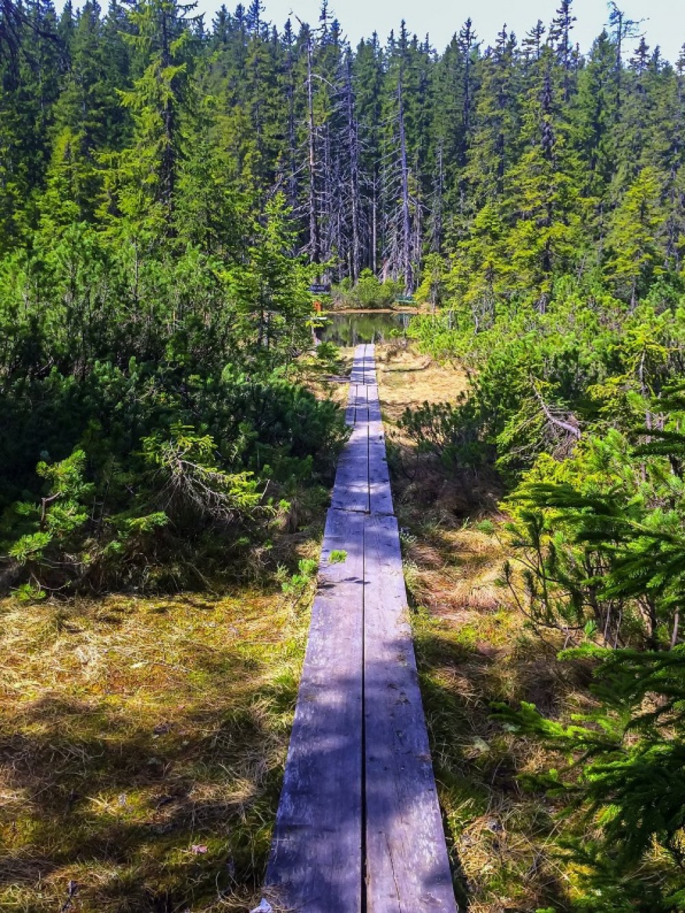 Nun führt der Wanderweg links, vorwiegend flach, von der Kleinbergalm durch den Wald zum Kraftplatz „Schwarzen Lacke“, dem sagenumwobenen Moorsee.
