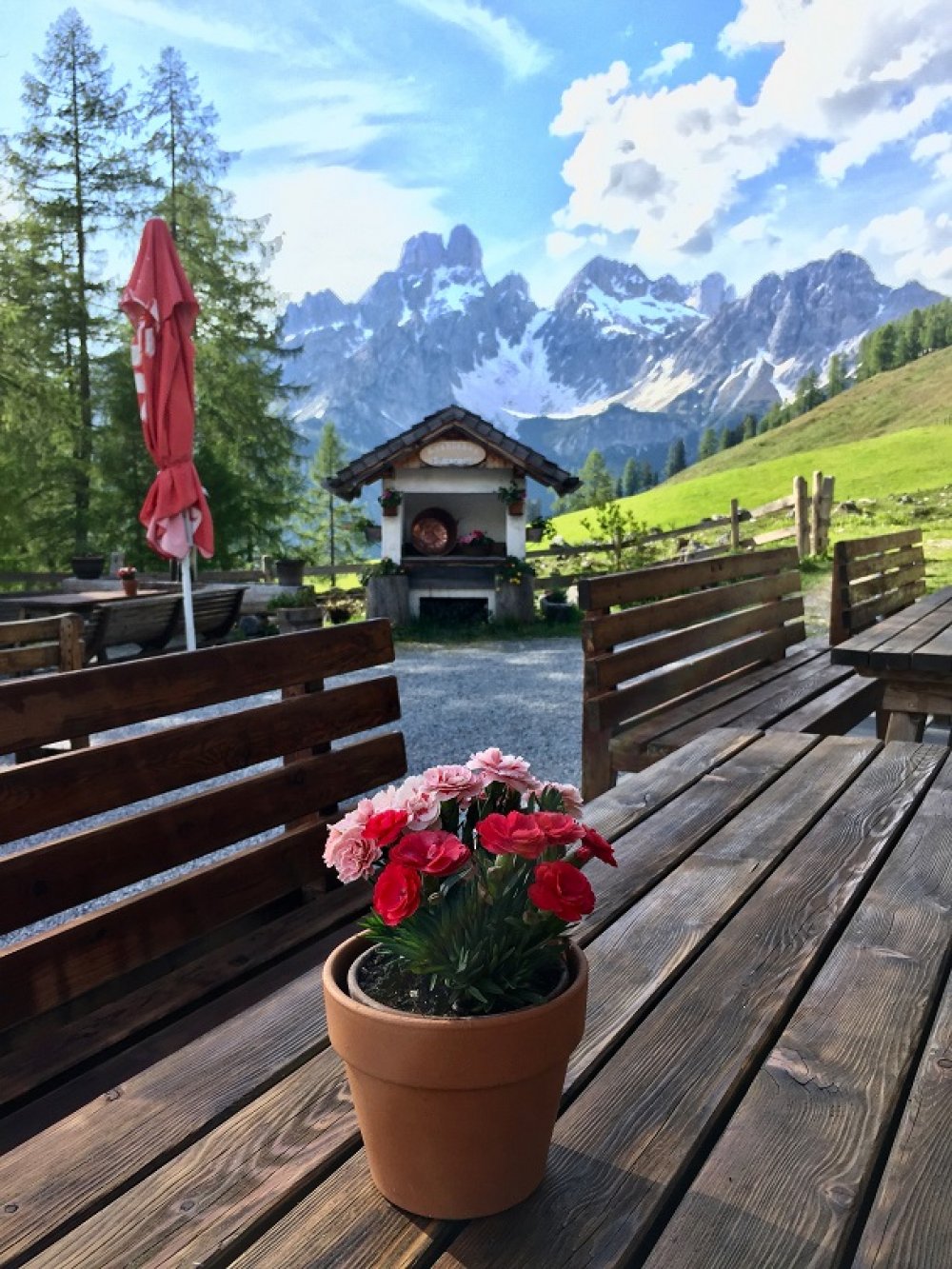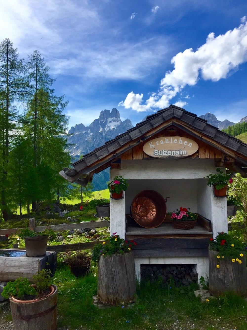 Die Krahlehenhütte befindet sich im Gebiet der Sulzenalm auf 1560 Metern Seehöhe und ist bereits seit dem Jahre 1864 im Besitz der Familie Kirchgasser-Haitzmann vom Krahlehenhof. Die Hütte wurde in den letzten Jahren liebevoll saniert und verschönert. Die wunderschönen Blumen um die Hütte sprießen in ihren schönsten Farben. Kurz gesagt: die Krahlehenhütte ist ein „Platzerl“ zum Wohlfühlen! Wir genießen das einzigartige Panorama von Bischofsmütze und Gosaukamm bis hin zum Rettenstein! Denn von der Terrasse der urigen Krahlehenhütte hat man den schönsten Blick auf diese Gebirgskette.