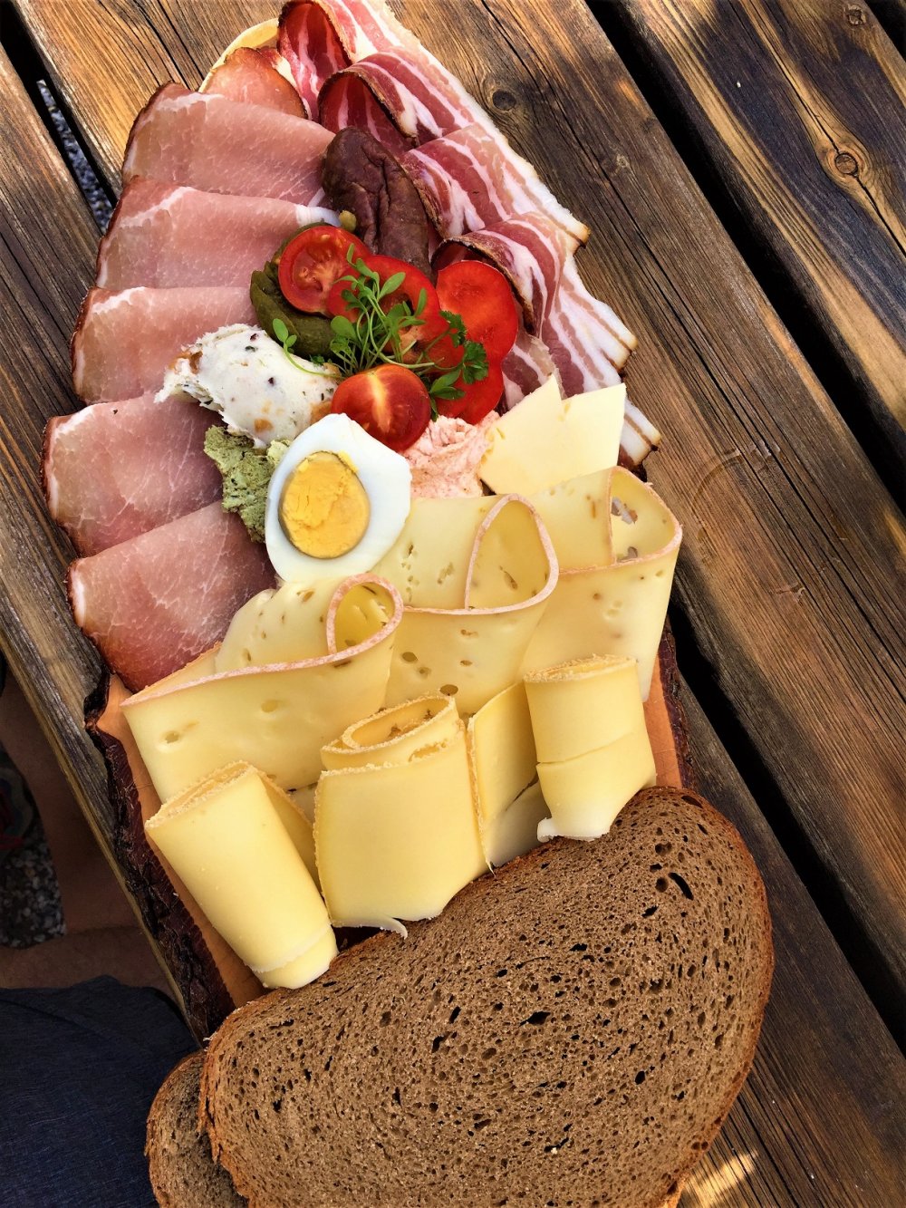 Der unverkennbare Duft von frischen Fleisch- und Blattlkrapfen kommt uns entgegen. Aber auch eine typische Brettljause, hausgemachter Käse, Kaiserschmarren und vieles mehr erwartet einen auf der Hütte. Ich gönne mir heute die bekannten „Kas-Krapfen“, von denen ich bereits gehört habe und die ich nun endlich mal selbst probieren möchte! Und wisst ihr was? Ich kann sie nur wärmstens weiterempfehlen – sie schmecken herrlich! Zum Abschluss teilen wir uns noch einen Beerenschmarren. Der süße Klassiker wurde etwas abgewandelt und mit aromatischen Waldbeeren verfeinert! Unser Fazit: Der Schmarren ist eine Sensation!