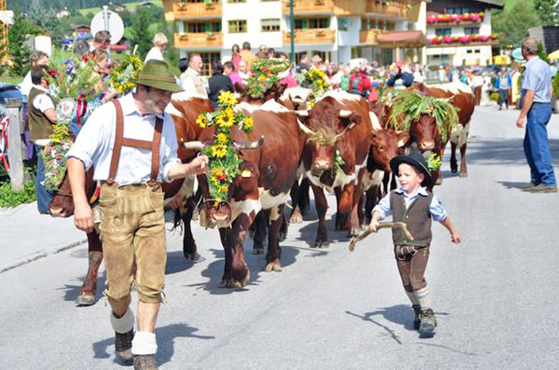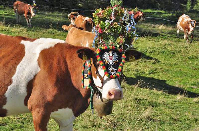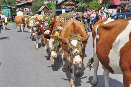 Im Herbst treibt man das Vieh von den Almen ins Tal. Das Weidevieh wird mit Kränzen, Zweigen und Bändern festlich "aufgekranzt" d.h. geschmückt. Besonders faszinierend sind die großen Glocken, die die Tiere umgehängt bekommen. Bei einem Unglück in der Familie oder mit einem Tier trägt das Vieh einen Trauerflor, eine Klagebüsche oder gar keinen Schmuck.