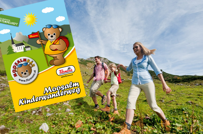 Das Wanderheft ist der wichtigste Begleiter auf der spannenden Wanderung hinauf zur Moosalm. Auf dem Weg trifft man auf 15 kleine Häuschen. In jedem "wohnt" ein Tier. Dieses ist auf dem Stempel dargestellt, der dann auf das passende Motiv im Wanderheft gedrückt wird. Sind alle 15 Tiere ins Heft gestempelt, dann ist der Wanderer oben auf der Moosalm angelangt. Stolz zeigt man dem Wirt der Moosalm die "erwanderten" Stempel und man bekommt von ihm den Moosalmbär als Abzeichen.
