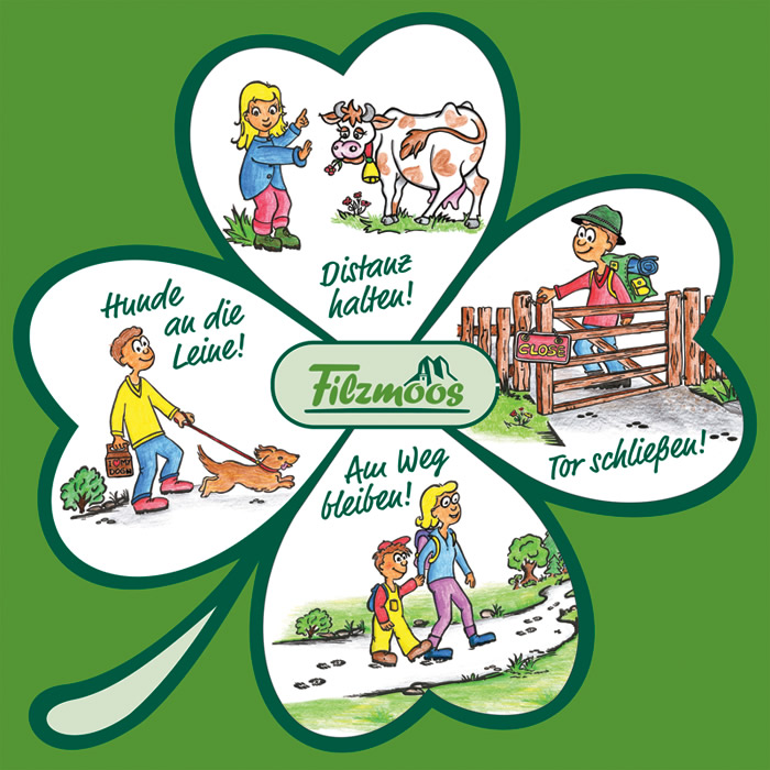 - Halten Sie Distanz zu den Kühen auf den Weiden und Almgebieten!
