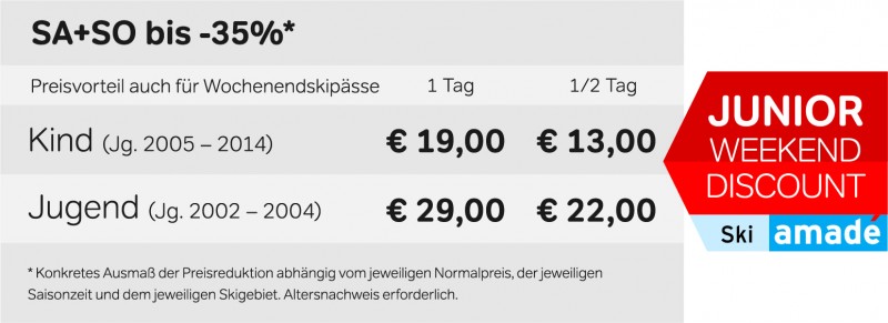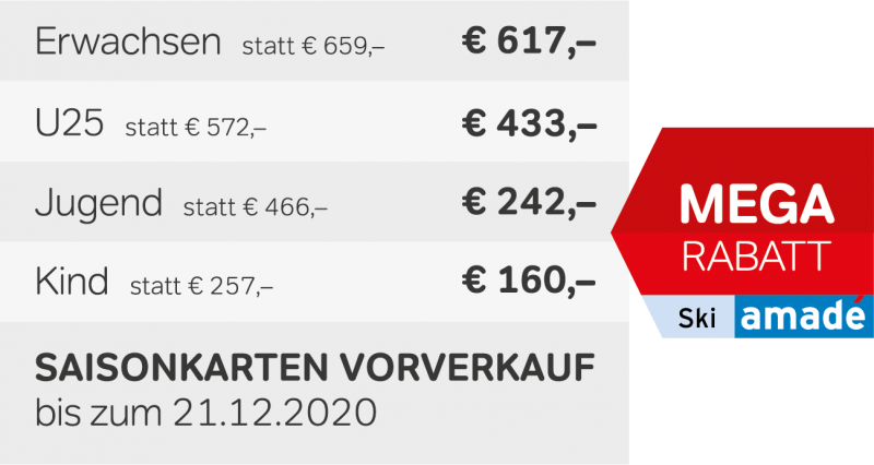 Alle Damen und Herren (Jhg. 2001 und früher geboren), erhalten bei der Buchung von mindestens 7 Nächtigungen (für 2 Personen) zwei 6-Tagesskipässe (1 + 1 gratis Skipasspaket) in einem teilnehmenden Unterkunftsbetrieb.Zu den Amadé Packages